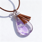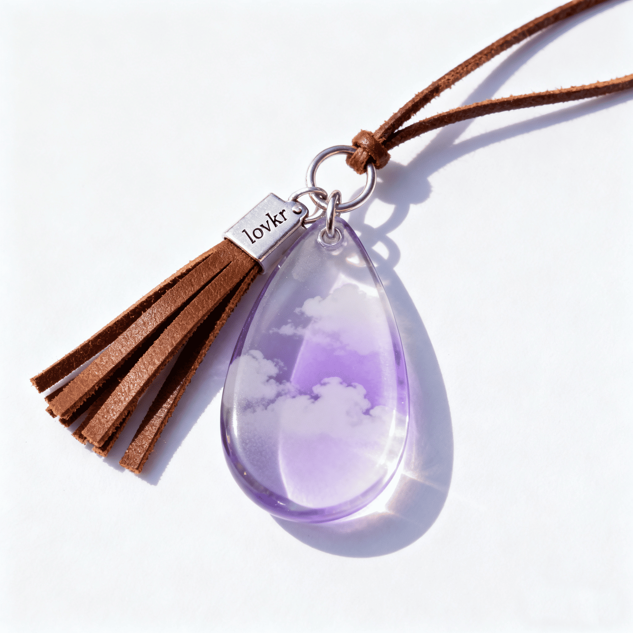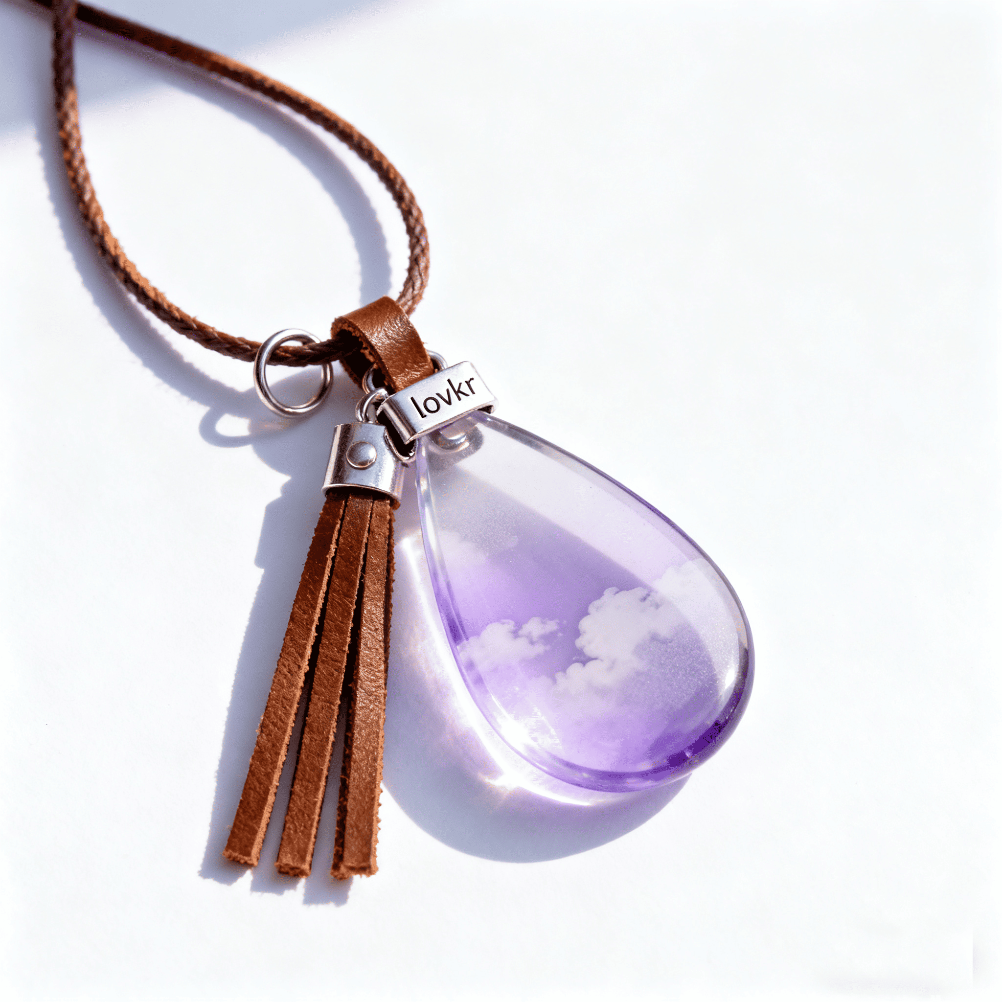 This bohemian-inspired necklace features a teardrop-shaped glass pendant with a soft gradient from light purple to lavender. Subtle frosted cloud-like textures float within the glass, creating a dreamy, airy visual effect. At the top of the pendant, three thin strips of brown genuine leather tassels bring a warm organic contrast to the smooth frosted glass. A silver-plated metal buckle engraved with “lovkr” securely connects the glass and tassel components. The piece is completed with an adjustable leather-and-metal mixed chain, allowing flexible styling. The gentle blend of purple and warm brown tones gives the necklace a relaxed, vacation-ready boho aesthetic.