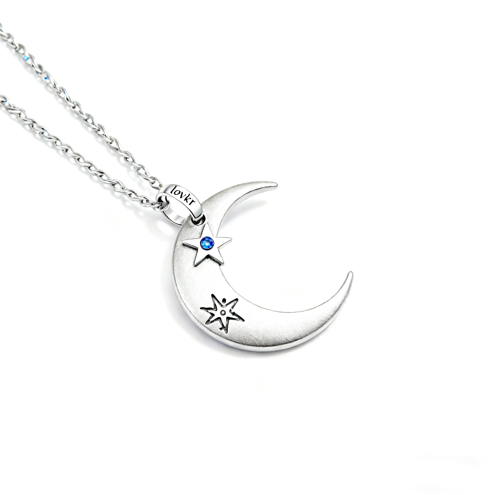 A polished mini ring engraved with “lovkr” connects the pendant to a thin silver wheat chain, enhancing the graceful, lightweight aesthetic. Photographed in soft 45° natural light with an ultra-detailed 8K matte metal texture, the pendant’s craftsmanship is showcased in crisp clarity—highlighting its cold-silver tone and gentle blue shimmer.